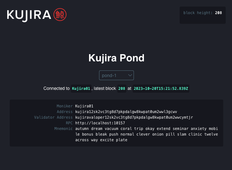 Pond creates an entire local Kujira network, complete with price feeders, and scaffolds out a dApp template that you can start building on straight away.
